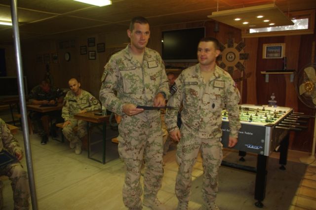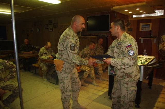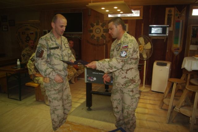 Pri príležitosti ukončenia pôsobenia vo vojenskej operácii ISAF veliaci poddôstojník slovenského kontingentu ISAF štábny nadrotmajster Rastislav BODNÁR ocenil pamätným odznakom vojenského veterána a ďakovným listom najlepších príslušníkov slovenského kontingentu z radov poddôstojníkov a vojakov mužstva.