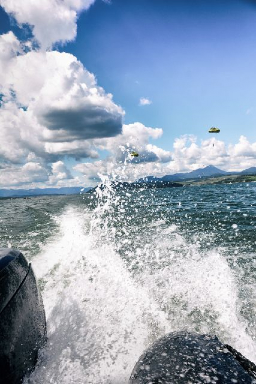 Pri ďalšej činnosti, zlanení za letu, sa pevná zem zmenila na pohybujúce sa dno člna ZODIAC FC 470 – to si vždy vyžaduje presnú spoluprácu pilota vrtuľníka i obsluhy člna.