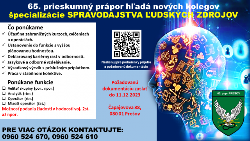 V súlade s Nariadením náčelníka generálneho štábu OS SR č. SCKM-45-158/2016 zo dňa 4. októbra 2016 o personálnom výbere profesionálnych vojakov do práporu ISTAR (65. prieskumný prápor) špecializácie 112 (odborník na spravodajstvo z ľudských zdrojov), vyhlasuje veliteľ pozemných síl OS SR výber profesionálnych vojakov na obsadenie funkcii ČŠp 112 na rote spravodajskej podpory 65. prieskumného práporu Prešov v hodnostiach: