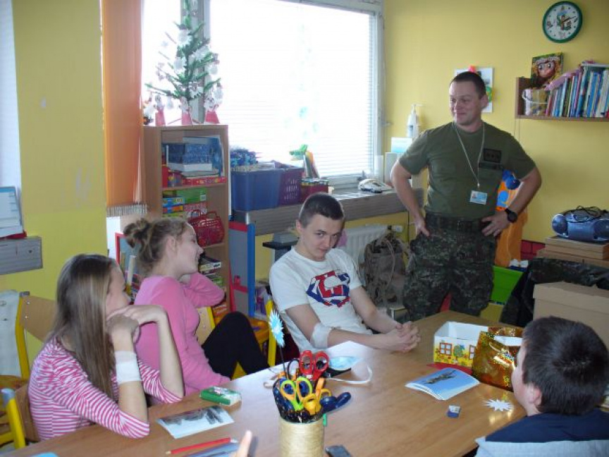 Skupina profesionálnych vojakov sa v stredu 12. decembra opäť stretla s deťmi a pedagogickým personálom základnej školy, ktorá sídli v tejto nemocnici. A ani tentokrát neprišli vojaci naprázdno. Na základe dobrovoľnej finančnej zbierky zakúpili pomôcky, z ktorých si deti s pomocou milých pani učiteliek vytvárajú kreatívne výrobky, a tak aspoň na chvíľu odvedú svoje myšlienky od nemocničného prostredia.