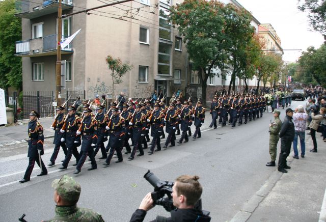 Na pravé poludnie za zvukov zvonov bratislavských chrámov a katedrál sa smútočný sprievod presunul z Bratislavského hradu cez Palisády do Prezidentského paláca. Na čele sprievodu pochodoval veliteľ Čestnej stráže prezidenta SR plukovník Miroslav Ištván. Za veliteľom so zástavou a štandardou prezidenta pochodovali príslušníci Čestnej stráže prezidenta SR, s bojovými zástavami príslušníci Čestnej stráže OS SR. Smútočnú atmosféru dotvárala Vojenská hudba OS SR. Súčasťou smútočného sprievodu boli dve prezidentove čestné jednotky. Popri rakve uloženej na historickej lafete pochodovali príslušníci prezidentovej stráže. Za rakvou  sa pomalým krokom presúval smútočný sprievod, ktorý tvorila najbližšia rodina, najvyšší ústavní činitelia, vzácni hostia. Na záver smútočného sprievodu pochodovalo stoosemdesiat príslušníkov Ozbrojených síl SR.